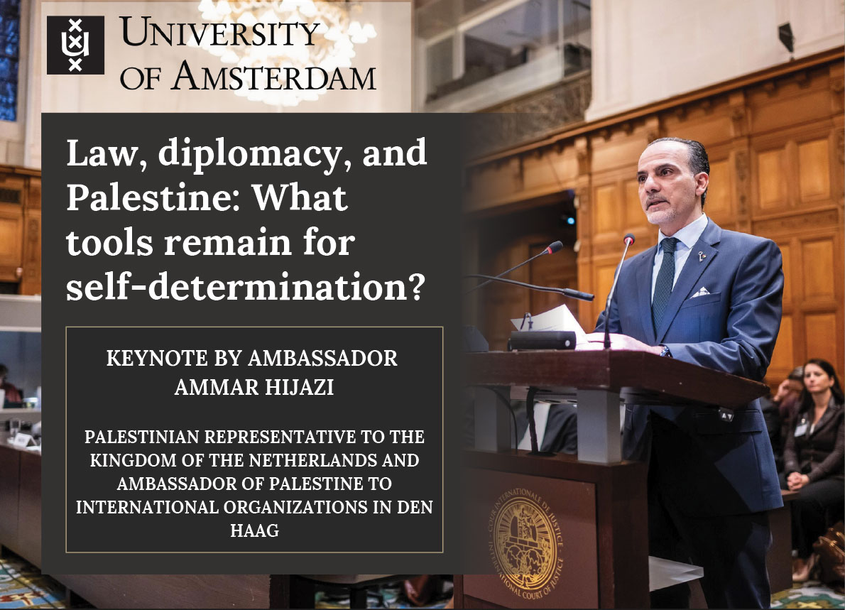 H.E. Ammar M.B. Hijazi, Palestinian Representative to the Kingdom of the Netherlands and Ambassador of Palestine to International Organizations in Den Haag since September 2024, will offer reflections on these questions. Drawing on his extensive diplomatic experience, Ambassador Hijazi will discuss the evolving multilateral terrain and the opportunities and limits of legal instruments in pursuing justice internationally. The event will also explore the intersection of law, politics, and public opinion in shaping international responses.